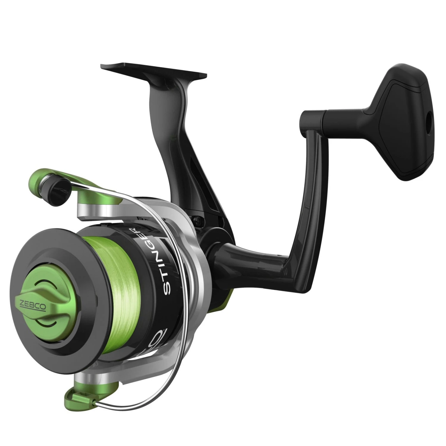 Cool look. Smooth operation. The sleek Zebco Stinger™ is built for style and performance. This reel has all-metal gears and a ball bearing drive for smooth retrieves fish after fish (adaptable for right- or left-handed anglers). Decked out with bright green accent colors and pre-spooled with fluorescent green fishing line—the price is pretty attractive, too.